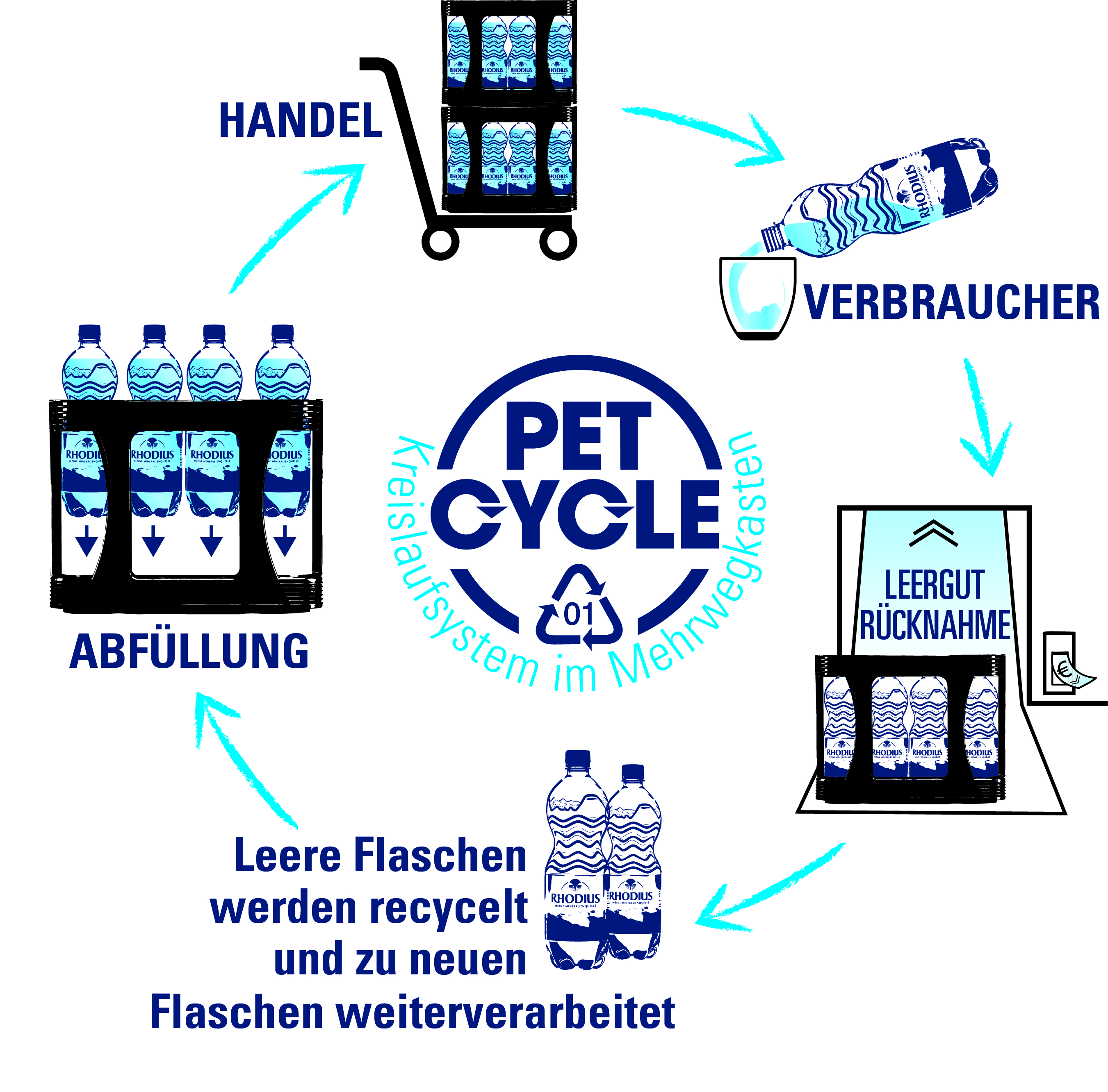 Wir bei RHODIUS füllen unser Mineralwasser in Glas-Mehrwegflaschen sowie PETCYCLE-Flaschen ab. Während Glas-Mehrweg jedem ein Begriff ist, stellt sich der ein oder andere bei PETCYCLE die Frage, um was es sich dabei handelt.
